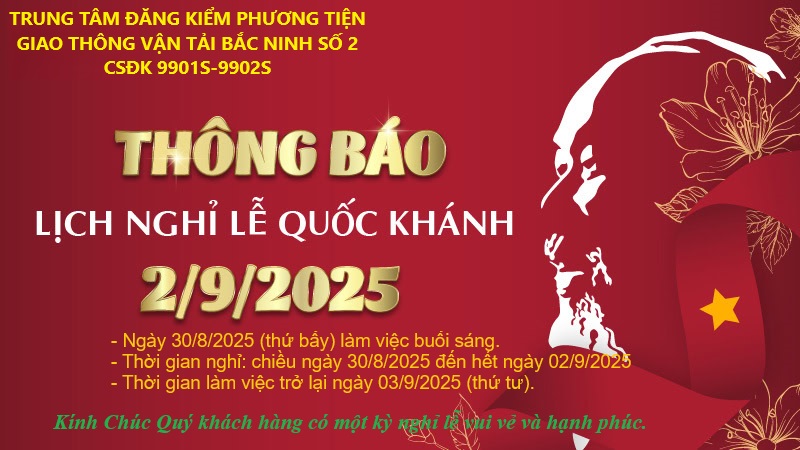 Trung tâm Đăng kiểm phương tiện giao thông vận tải Bắc Ninh số 2 (mã số 99-01S và 99-02S) thông báo tới Quý khách hàng lịch nghỉ làm việc Lễ 2/9 năm 2025 như sau: